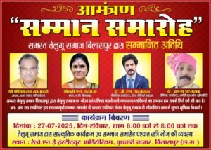 बिलासपुर:- बिलासपुर में तेलुगु समाज का गौरव सम्मान समारोह 27 जुलाई 2025 को आयोजित किया जाएगा। यह कार्यक्रम रेलवे नॉर्थ ईस्ट इंस्टिट्यूट सभागार, बुधवारी बाजार में शाम 6:30 बजे से चालू होगा। इस अवसर पर चार विशिष्ट व्यक्तित्वों को सम्मानित किया जाएगा।