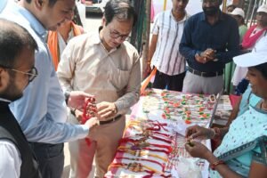 जिला पंचायत अध्यक्ष राजेश सूर्यवंशी और कलेक्टर संजय अग्रवाल ने चर्चा कर दीदियों का उत्साह बढ़ाया और कामकाज के विषय में जानकारी ली। जिला पंचायत अध्यक्ष राजेश सूर्यवंशी और कलेक्टर संजय अग्रवाल ने दीदियों से तिरंगा, राखियां सहित अन्य पूजन सामग्री खरीदी।
